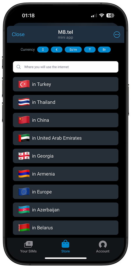 eSIM AVEASIMeSIM TURKCELLeSIM VodafoneeSIM | 0.55 €, 1day100 Mb 2.90 €, 7days1 Gb 5.80 €, 14days2 Gb 14.50 €, 30days5 Gb 29.00 €, 30days10 Gb 0.50 €, 1day100 Mb 1.60 €, 7days1 Gb 3.19 €, 14days2 Gb 7.79 €, 30days5 Gb 14.78 €, 30days10 Gb 0.50 €, 1day100 Mb 2.15 €, 7days1 Gb 4.30 €, 14days2 Gb 10.39 €, 30days5 Gb 19.35 €, 30days10 Gb 0.50 €, 1day100 Mb 2.10 €, 7days1 Gb 4.10 €, 14days2 Gb 10.10 €, 30days5 Gb 19.70 €, 30days10 Gb |